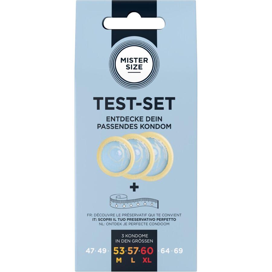 Encuentra tu talla con el juego de prueba de tallas. El kit de prueba MISTER SIZE, con cinta métrica y paquete de prueba mediano, te ayuda a encontrar tu talla de condón ideal. Las tallas de 53 mm, 57 mm y 60 mm incluidas en el kit cubren las más comunes. Si usas una talla diferente, puedes comprobarlo con la cinta métrica y sentir la diferencia con el paquete de prueba mediano.