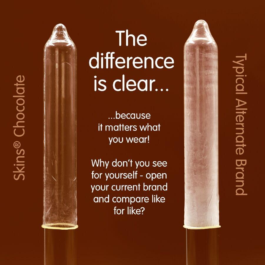 Presentamos nuestro nuevo paquete de 8 con sabor a chocolate, con un diseño elegante y listo para usar, y hasta un 33 % más de condones que el líder del mercado. Atrae a quienes buscan un producto íntimo divertido y de alta calidad con los condones Skins sabor chocolate. Estos condones envueltos individualmente combinan un sabor placentero con una protección superior, lo que los convierte en la opción ideal para tiendas de productos para adultos, farmacias y distribuidores de productos de bienestar. Estos condones Skins son una excelente manera de combinar dos amores: el sexo y el chocolate. Están lubricados y tienen un delicioso aroma a chocolate, realmente tentador, y además saben a chocolate. Como todos los condones Skins, están hechos de látex de alta calidad, dermatológicamente probado, que te brindará la protección que necesitas.