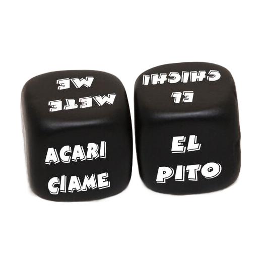 SET DE 2 DADOS DE COLOR NEGRO DE GRAN CALIDAD DE 25 mm de ACCION Y PARTE DEL CUERPO que van en una bolsita de seda transparente. Estos dados te dirán la acción que debes hacer en la parte del cuerpo de tu chico o chica.